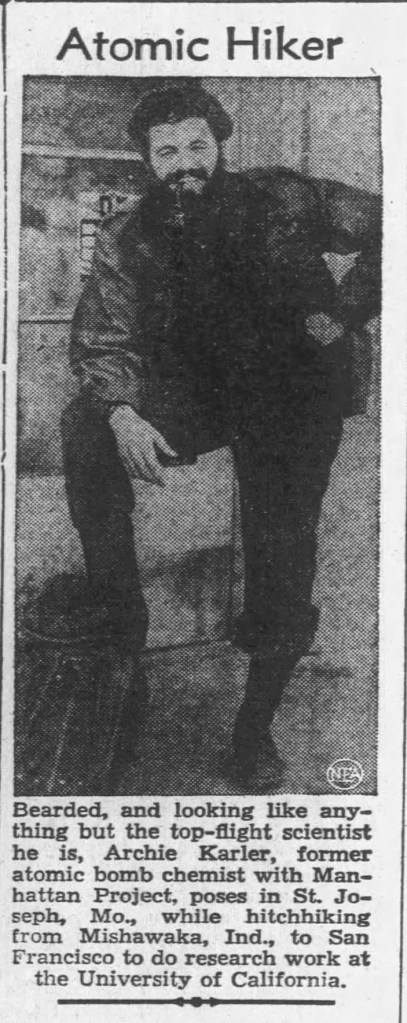 Grappling with the death of his brother, Arthur pressed on with his pursuit of science to help change the world. A 1943 article of the South Bend Tribune said he was accepted into pre-medical school at Indiana University Bloomington and was expected to start in May 1944. However, from late 1943 to early 1947, there is a black hole of information for Arthur, and that is due to his involvement in the Manhattan Project and its highly secretive nature. However, by January 1947, he reappears in the news and is referred to by the nicknames of “Archie” and “Beardo” in an article reprinted in newspapers across the country. The article, which is slightly edited from paper to paper, refers to him as a bearded, high achieving atomic scientist who worked on the Manhattan Project as a chemist. The details of the facility he worked at and his specific role as a chemist in the Manhattan Project largely remain unknown due to the nature of the project itself. The topic of the 1947 article is how he decided to walk and hitchhike from Mishawaka, Indiana, to the University of California at Berkeley, where he would do graduate research there for an atomic cure for cancer.