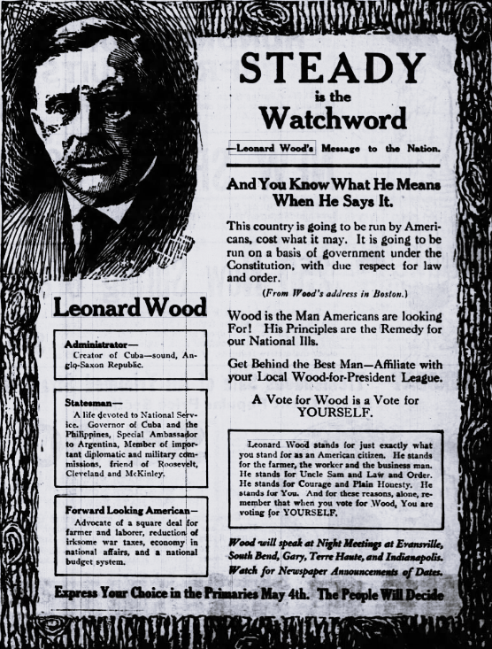 In the latter half of April, every campaign descended on Indiana, with the most money being spent by the Johnson and Wood campaigns. General Wood began an advertisement and speech blitz across the entire state. On April 29, advertisements started to appear in local newspapers that General Leonard Wood would give short stump speeches in Goshen, Elkhart, and Mishawaka, with a main event speech in South Bend on May 1. While General Wood had these advertisements in most newspapers, there were none regarding his Mishawaka visit in The Mishawaka Enterprise. My theory is that while his main speech in South Bend had been planned possibly weeks in advance, his campaign decided to include short stump speeches beforehand in a last-minute effort to drum up more support, as a 3-day notice for a political event seems too short of a window.