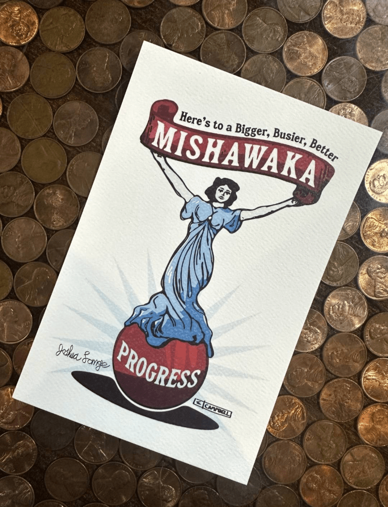 There has been an overwhelming number of positive responses about the Mishawaka banner created by myself and my talented artist friend, Sadie Campbell. This support led to the City of Mishawaka asking for our permission to use the banner art at Rose Park, to which we enthusiastically agreed!